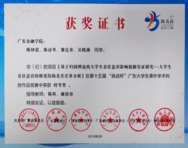 “挑战杯”全国大学生课外学术科技作品竞赛,被誉为中国当代大学生科技创新的“奥林匹克”盛会,是全国最具代表性、权威性、示范性、导向性的大学生学术科技作品竞赛。“挑战杯”已经形成了国家、省、高校三级赛制, “挑战杯” 广东大学生课外学术科技作品竞赛每两年举办一届,自1989年创办以来,今年是广东省“挑战杯”举办的第三十年。本届大赛由共青团广东省委员会、广东省教育厅、广东省科学技术厅、广东省科学技术协会、广东省学生联合会、佛山市人民政府共同主办,全省137所高校申报的2627件作品经评审后,共有751份作品入围终审决赛,我校共10项作品获奖,其中特等奖1项、二等奖2项、三等奖7项,自2011年以来我校再次荣获省赛特等奖,是我校历年参加“挑战杯”广东大学生课外学术科技作品竞赛取得的最好成绩。