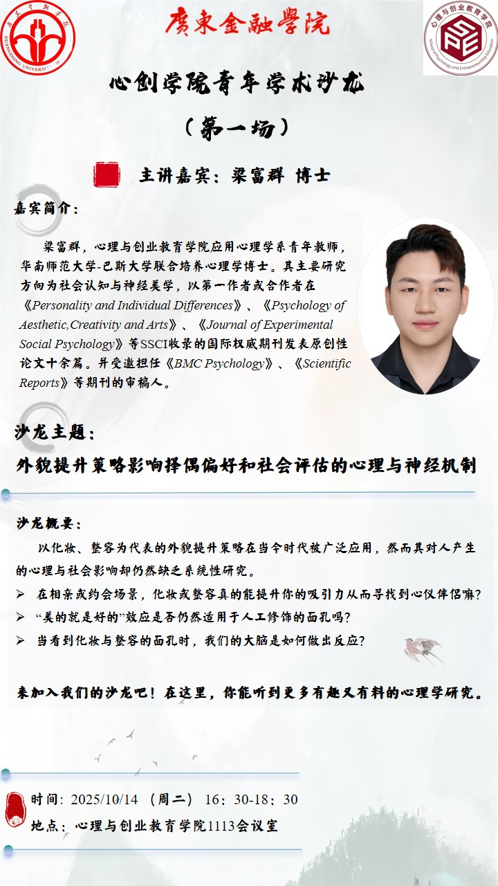 10 月 14 日下午,taptap点点官方网站 1113 会议室里座无虚席,广金taptap点点官方网站青年学术沙龙(第一场) 在此顺利举办。本次沙龙邀请到应用心理学系青年教师梁富群博士主讲,围绕 “外貌提升策略影响择偶偏好和社会评估的心理与神经机制” 展开深度分享,带现场师生走进了一场兼具科学性与趣味性的心理学探索之旅。