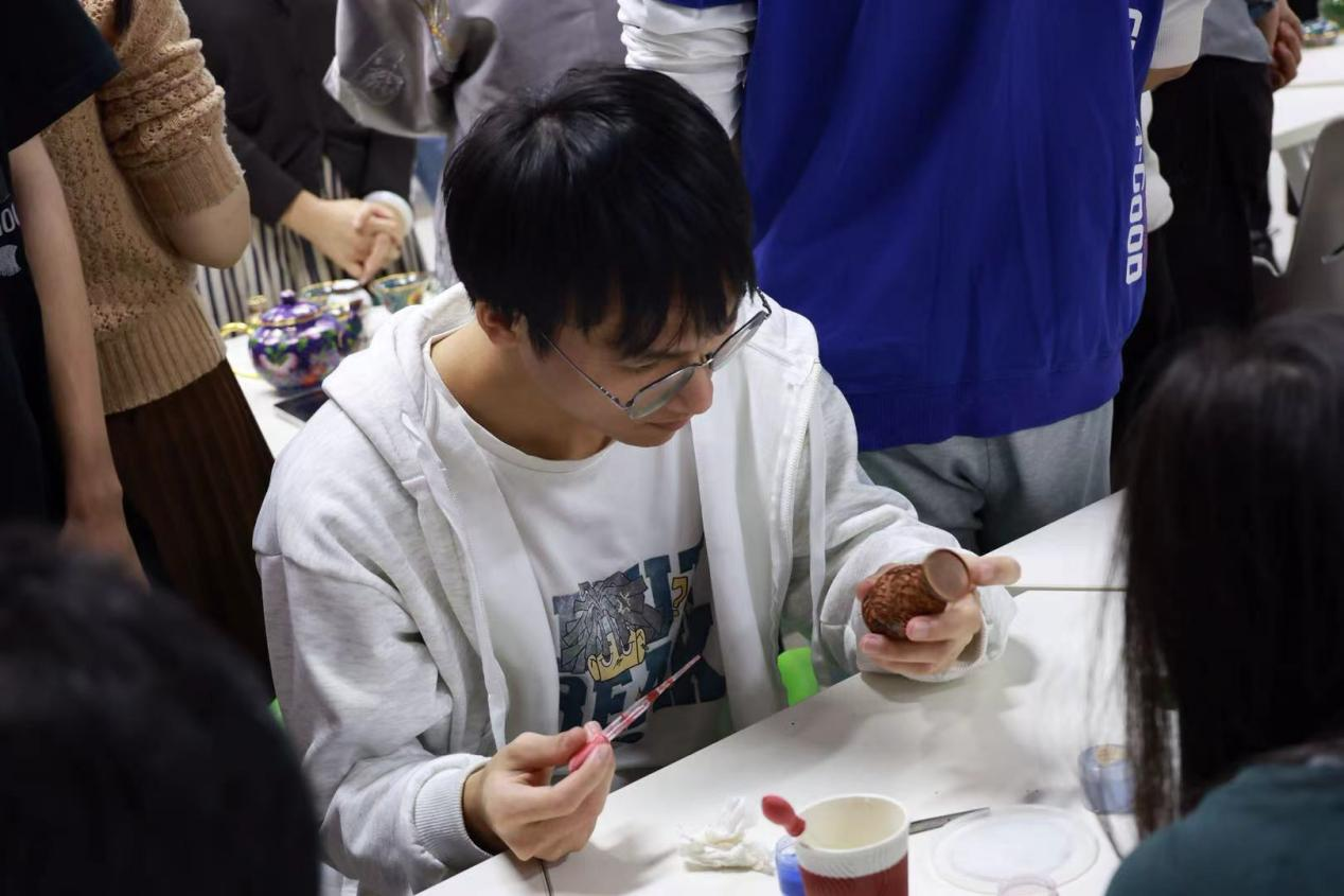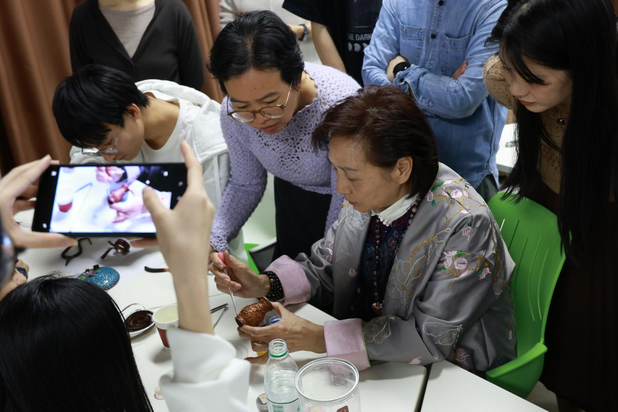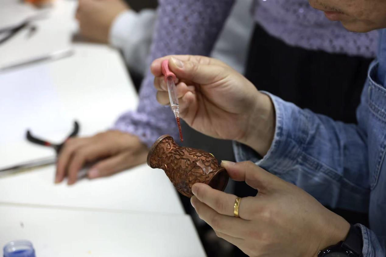 点蓝体验环节同步开展,专家先是详细拆解珐琅釉料的色彩搭配逻辑与填充核心技巧,通过实物展示不同釉料的融合效果,随后将调配就绪的红、蓝、绿等多种釉料及点蓝针分发给现场同学,引导大家在自己完成的掐丝花纹空隙中均匀填釉,沉浸式体验“色随釉落、彩随心动”的传统创作乐趣。
