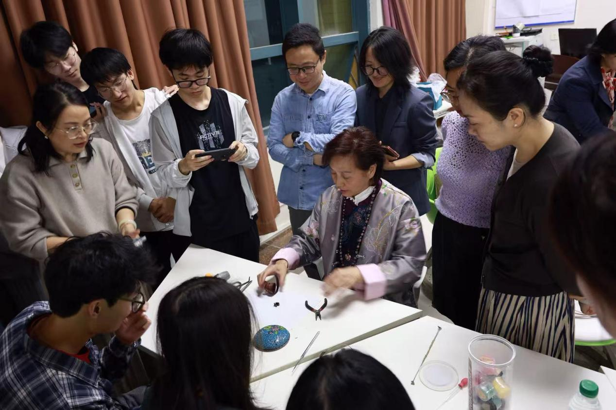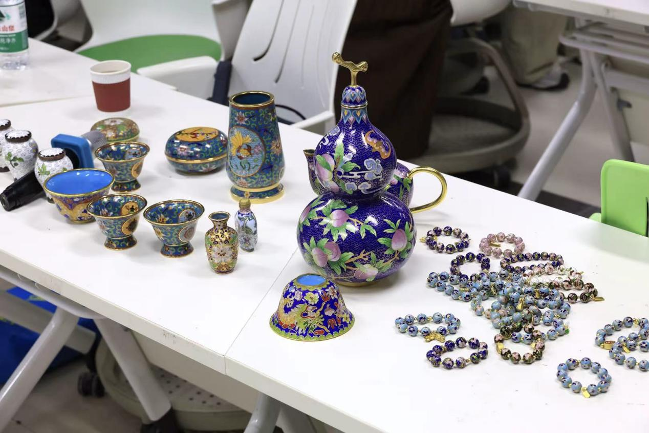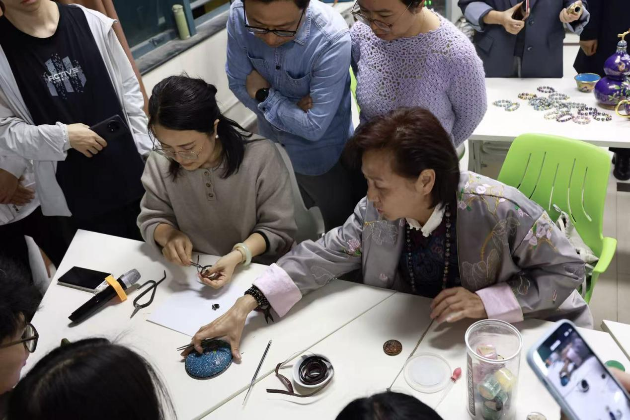 同学们在胡淑兰的一对一指导下,耐心完成掐丝、点蓝全流程操作,亲手打造出小型景泰蓝半成品,直观感受传统技艺的严谨与灵动。