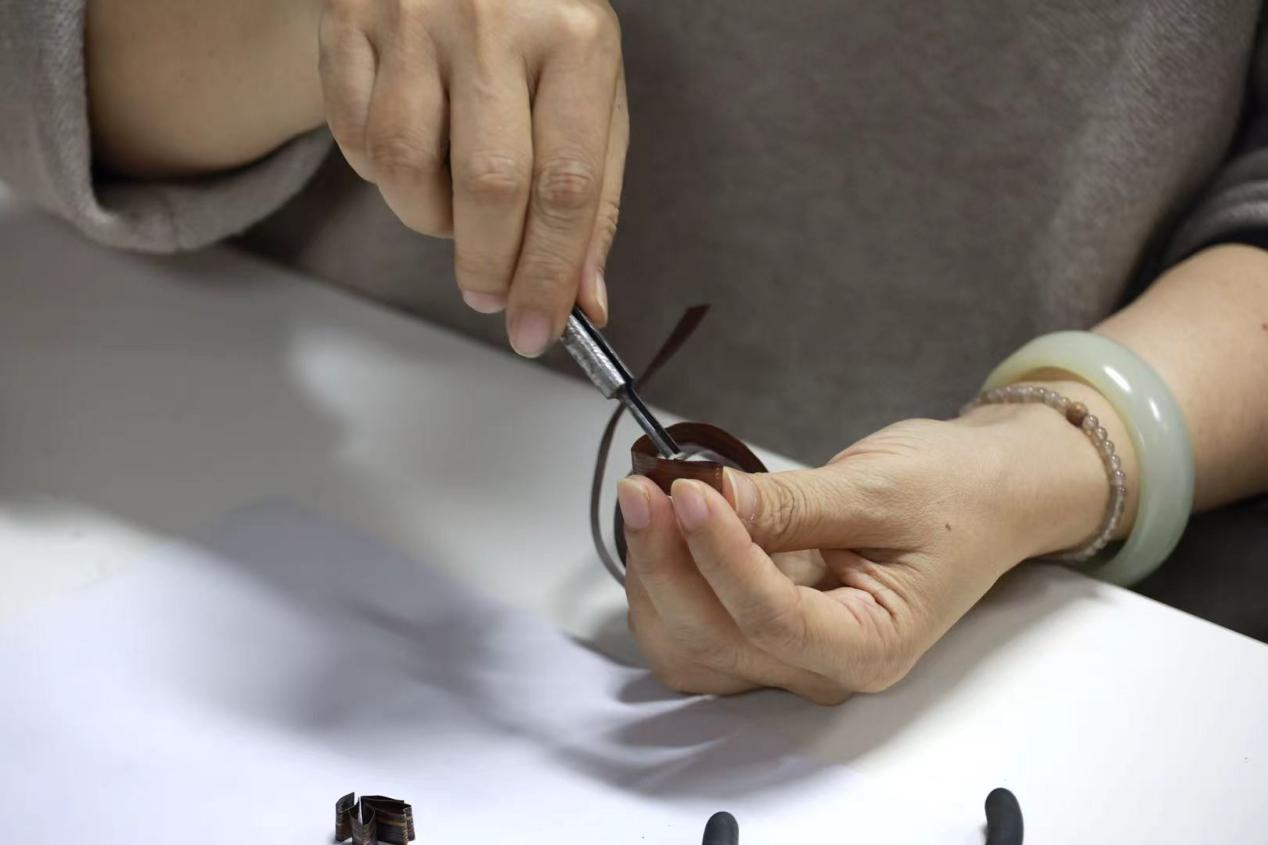在掐丝体验环节,胡淑兰现场演示了扁铜丝弯折、塑形、粘丝固定等基础技法,将提前备好的铜丝、胎板、粘胶等材料逐一分发至同学们手中,细致指导大家对照预设纹样勾勒线条、拼接造型,让同学们在亲手操作中直观感受“丝随形走、纹随手生”的精细质感。